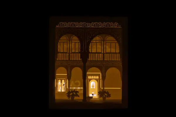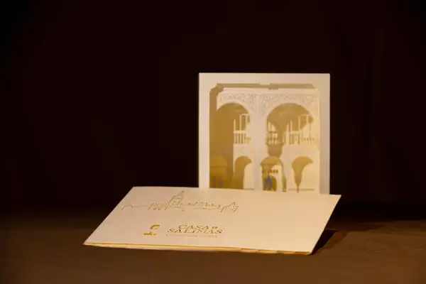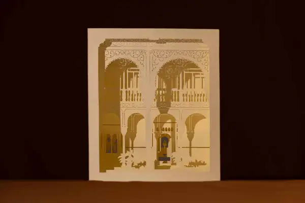 Maqueta en papel 3D de ENCAJA que reproduce el patio de la Casa de Salinas en Sevilla. Una pieza didáctica, creativa y decorativa.